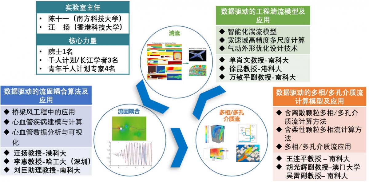 粵港澳數據驅動下的流體力學與工程應用聯合實驗室瞄準我國在先進制造、航空航天、健康醫療等領域面臨的挑戰和重大戰略需求,集中粵港澳地區有國際競爭力的科學家,發揮流體力學和數據驅動方面的學術與工業設計軟件方面的優勢力量,開展以下三大方向的研究:數據驅動的工程湍流模型及應用、數據驅動的流固耦合算法及應用、數據驅動的多相流和多孔介質流的計算模型及應用,重點解決制約廣東省高端裝備制造業所面臨的基礎問題、共性技術、工程應用等問題,對于突破廣東省高端裝備制造業、航空航天、健康醫療等工程應用中的卡脖子技術具有重要的現實和戰略意義。實驗室由南方科技大學、香港科技大學、哈爾濱工業大學(深圳)、澳門大學、深圳清灃溪科技有限公司共同組建,南方科技大學陳十一院士擔任實驗室主任。