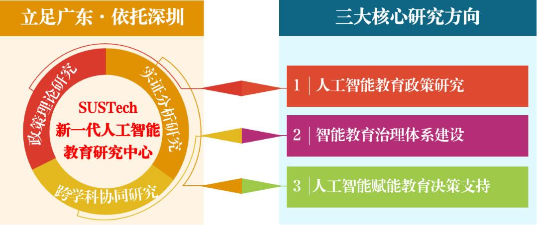 南方科技大學新一代人工智能教育研究中心專注于“人工智能教育政策研究”、“智能教育治理體系建設”和“人工智能賦能教育決策支持”三大核心研究方向。中心立足廣東省,依托深圳市人工智能高科技產業及其應用,面向人工智能在教育政策制定與治理中的深度應用,開展系統化的政策理論研究、實證分析研究和跨學科協同研究。中心聚焦廣東省教育改革與創新發展需求,提供高質量的智庫支持,推動教育決策的科學化、精準化與智能化。通過探索智能時代的教育治理新模式,力求打造廣東乃至全國的人工智能教育決策咨詢領域的“廣東樣板”和“廣東典范”,為促進教育現代化和高質量發展,實現教育強國貢獻智慧與力量。